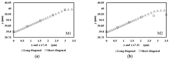 Figure 6 shows the comparison between the Knoop indentation diagonals at maximum load. To make possible this comparison, the indentation profiles were normalized by considering the value of the R-ratio between the indenter diagonals (R equal to 7.11). Figure 6a shows that in the material M1 the two diagonal exhibit a similar behavior. In the case of the materials M2 and M3 sink-in is observed along the short diagonal. Moreover, the sink-in slightly increases with the value of the ratio .