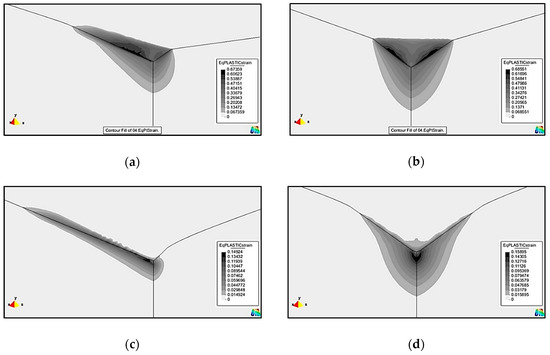 The effect of the indenter geometry on the equivalent plastic strain distribution of the indentations was also studied. Figure 7a,c shows the equivalent plastic strain distributions obtained at the maximum load in the numerical simulations of the materials M1 () and M3 using the Knoop indenter. For comparison, the same figure also shows the same distributions obtained with the Vickers indenter (Figure 7b,d).