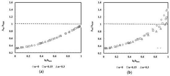 Figure 8 shows the evolution of the indentation contact areas, and , as a function of the ratio . These contact areas are normalized with respect to the reference area, , corresponding to the obtained with the area function of the indenter (Equation (5), with equal to the indentation depth, which does not take into account the pile-up or sink-in formation). Figure 8a shows that the contact area, , is independent of the strain hardening parameter and Young’s modulus, whatever the value of the ratio . Moreover, the ratio is always less than 1. Figure 8b shows that the numerically calculated contact area, , is nearly independent from the strain hardening parameter and Young’s modulus, for the ratio . However, for the normalized contact area depends on the strain hardening parameter. The ratio is even higher than 1 after a value of that depends on the strain hardening parameter ( equal to 0.85, 0.90 and 0.95 for n equal to 0, 0.15 and 0.3, respectively), indicating pile-up formation. For both cases, and , similar behaviors were previously observed for the case of the conical, Vickers and Berkovich indenters (see, e.g., [22,26,30]).