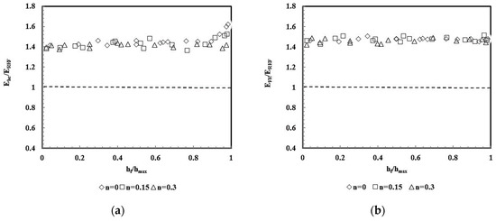 Figure 9 shows the evolution of the Young’s modulus and normalized by the input value used in the numerical simulation, , as a function of the ratio . The average ratio of is close to 1.419, except for values of approaching 1, for which the ratio increases for low values of the strain hardening parameter of the materials (n = 0 and 0.15). This is a consequence of the pile-up formation during the indentation of these materials, as was also observed for Vickers indenters [25]. The ratios of are slightly higher than those of , being in average close to 1.469. Slight differences between both ratios, and , were already observed for the Vickers indenter [25]. Under these conditions, in the experimental indentation tests, a value for the correction factor of 1.419 is required to be used for the contact area evaluation () from the unloading curve, in case of the Knoop indentation. This value is essentially different from other indenter geometries such as conical, Vickers and Berkovich, which require values around 1.034, 1.055, 1.081, respectively (see, e.g., [22,26]).