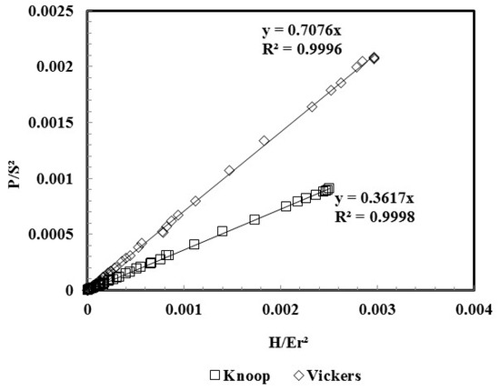 Equation (4) was used in order to confirm the above correction factor . Figure 10 shows the ratio versus obtained by numerical simulation of all materials in Table 2, for the case of the Knoop and Vickers indenters. The reduced Young’s modulus, , was determined considering the input Young’s modulus and Poisson ratio, , determined using the contact area evaluated from the contour of the indentations.