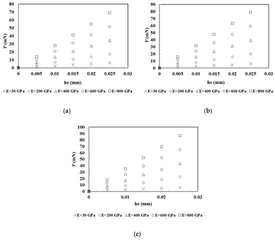Using flat indenters, numerical simulations were performed up to a displacement imposed so that only elastic deformation occurs in the material beneath the indenter. Five values of Young’s modulus were used: 30, 200, 400, 600 and 800 GPa. Figure 11 shows the evolution of the load as a function of the indentation depth, , obtained in the numerical simulations with the flat indenters for values of the R-ratio equal to 1 (as for the Vickers indenter), 4 and 7.11 (as for the Knoop indenter). The figure shows that, for a given indentation depth, the load increases with the increase of the Young’s modulus and the R-value.