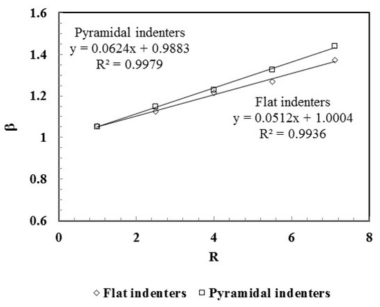 Figure 12 shows that the evolution of with R for the flat punches is a quasi-linear function, quite close to that observed for the case of the pyramidal indenters (obtained with Equation (4): 1.054, 1.141, 1.232, 1.351 and 1.473). Moreover, the values of for the pyramidal indenters are slightly higher than those determined for the flat indenters, except the R-ratio equal to 1.