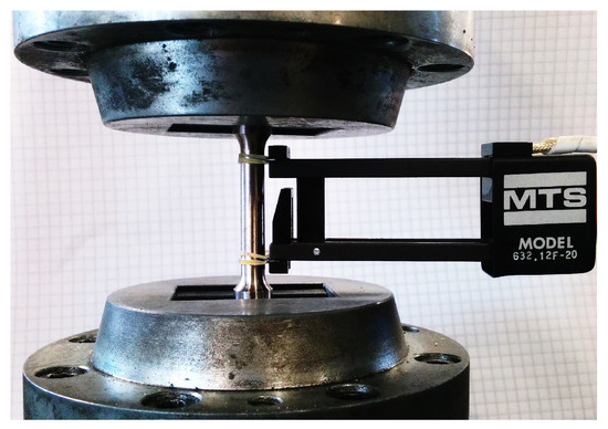 Two cylindrical specimens having a 6.25-mm diameter were extracted from each bar and tested through a quasi-static tensile test on a MTS hydraulic test machine. The tensile load N was recorded by a 50 kN load cell and the elongation of a 25 mm reference test length was measured by an estensometer, as shown in Figure 1. The engineering stress and strain were then computed according to standard engineering definitions.