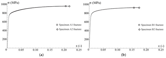 The results of the tensile tests for Bar A and Bar B specimens are shown in Figure 3. The tensile curves obtained from specimens belonging to the same bar are in very good mutual agreement and only some slight differences can be observed in the engineering ultimate stress and in the engineering fracture strain . The engineering ultimate stress was obtained from the experimental data as the maximum stress recorded during the tensile test. The yield stress was computed considering the stress which, after unloading, produces 0.2% residual strain.