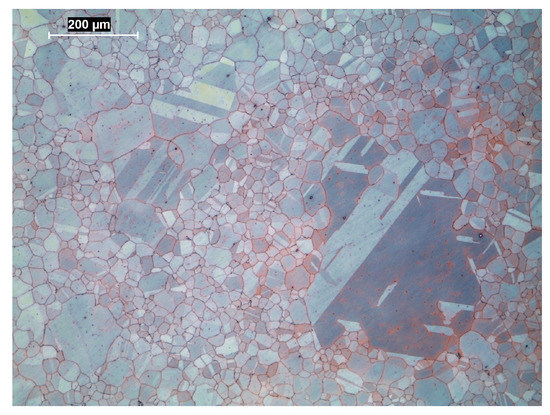 - ASTM International. Standard Test Methods for Determining Average Grain Size; ASTM E-112; ASTM International: West Conshohocken, PA, USA, 2010. [Google Scholar]