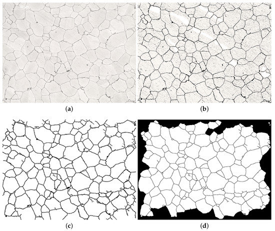 Comparing Figure 6a,d, almost all the grain boundaries are correctly detected by the developed procedure and only few very small grains, which can be recognized only at high magnification factor, are erroneously detected. After the above described elaboration, an automated tool which detects white pixels within closed regions was used to measure the area of each grain.