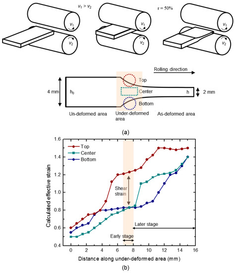 (a) Schematic illustrations of the asymmetrical rolling (AR) deformation of AZ31 Mg alloy from the left to the right and the cross section of the deformed sample that was stopped in the middle of AR and (b) a variation of calculated effective strain calculated by finite element analysis taken from [16]. The shaded area means the early stage of AR deformation by stopping.