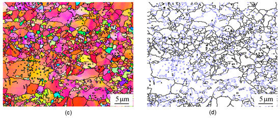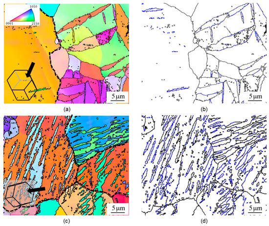 Figure 2 displays the microstructure of the deformed sample in the center and top areas at the early stage of deformation where a number of deformation twins were nucleated [17,18]. Figure 2a shows the inverse pole figure (IPF) image in the center area consisting of a coarse grain with strong basal orientation and some neighbouring grains with weak basal orientation. The yellow grain with strong basal was characterized with its direction of c-axis being nearly parallel to the normal direction (ND), whereas several grains with weak basal were determined with their c-axis being perpendicular to ND. In Mg alloys, the twin boundaries would be discriminated by means of grain boundary (GB) map. Figure 2b shows the GB map revealing the boundaries of the regular grains and twins that were represented as black and blue lines, respectively. It was shown from morphologies that the grains with strong basal contained no twin inside. This differed clearly from the neighbouring grains with weak basal orientation. These twin boundaries detected would be {} extension-typed of twin. Thus, extension twin would be absent in grains with strong basal orientation. Irrespective of basal orientation, a number of extension twins were detected inside most of the deformed grains in the top region, which was affected by local shear deformation imparted during AR. The similar result was reported earlier when extension twin occurred in response to local anomalous stress states [19]. Extension twin {} corresponding to specific misorientation of ~86° was used to tailor mechanical properties since such twin would store the granular dislocation and work also as a dislocation barrier, affecting the hardening response in hcp metals during deformation [20,21,22].