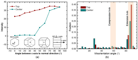 The fraction of twin formed inside grain would depend on the initial orientation of the parent grain. In case of extension twin, if the parent grain was positioned with the c-axis perpendicular to the compression direction, the extension twin would appear with ease [23]. Thus, the fraction of the twin would be activated depending on the parent grain whose orientation varied based on the angle between c-axis and ND as shown in Figure 3a. In the top region, the extension twin formed with intensity higher than 20 in both strong and weak basal orientations. This was in contrast to the case in the center region where the twin was absent wholly in grains with an angle between c-axis and ND ranging from 0 to 40°. This would result in a significant difference in the fraction of deformation twin between the center and top regions. The distributions of boundary misorientation in the center and top regions are presented in Figure 3b. The average misorientations in the center and top areas was observed to be ~33° and ~51°. It was inferred that the high average misorientation was attributed to the broad range of grain orientation as well as to the inherent misorientation of extension twin itself.
