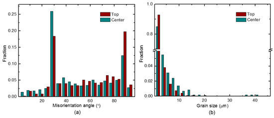 (a) Misorientation distribution of boundaries and (b) size distribution of grains in the center and top regions at the late stage of AR deformation.