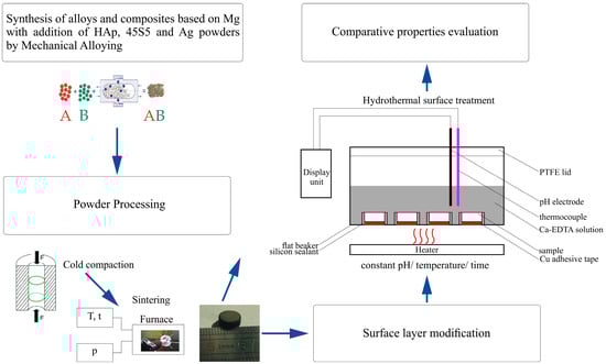 The magnesium alloys and the bioceramic composites based on these alloys were prepared by MA and powder metallurgy where bioceramic = hydroxyapatite (HAp) and 45S5-Bioglass (BG) according to Figure 1 processing scheme. The proposed weight proportions were also modified by the addition of silver as follows: