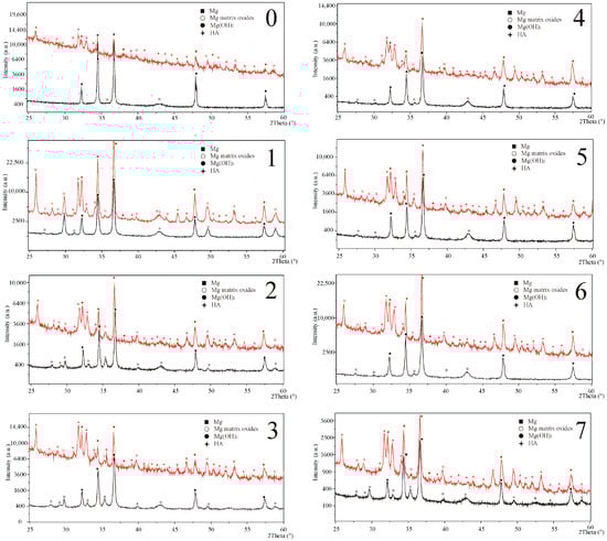 XRD spectra of the base (black) and hydrothermally treated (red) samples with detected phases marked in accordance to sample composition. (0): Mg pure—Reference sample; (1): Mg4Y5.5Dy0.5Zr; (2): Mg4Y5.5Dy0.5Zr + 5%BG; (3): Mg4Y5.5Dy0.5Zr + 5%BG + 1%Ag; (4): Mg1Zn1Mn0.3Zr; (5): Mg1Zn1Mn0.3Zr + 5%HA; (6): Mg1Zn1Mn0.3Zr + 5%HA + 1%Ag; (7): Mg1Zn1Mn0.3Zr + 10%HA.