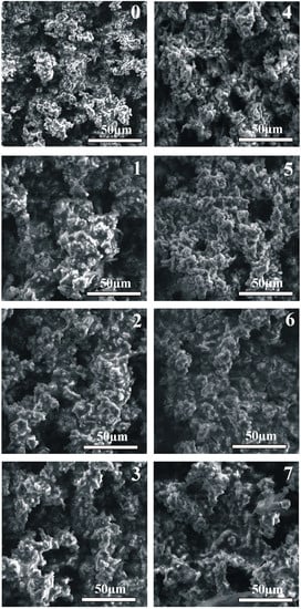 Surface view of the obtained hydrothermally treated hydroxyapatite surface layers on the substrates marked in accordance to sample composition. (0): Mg pure—Reference sample; (1): Mg4Y5.5Dy0.5Zr; (2): Mg4Y5.5Dy0.5Zr + 5%BG; (3): Mg4Y5.5Dy0.5Zr + 5%BG + 1%Ag; (4): Mg1Zn1Mn0.3Zr; (5): Mg1Zn1Mn0.3Zr + 5%HA; (6): Mg1Zn1Mn0.3Zr + 5%HA + 1%Ag; (7): Mg1Zn1Mn0.3Zr + 10%HA.