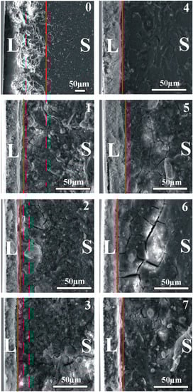 Cross-section view of the obtained hydrothermally treated hydroxyapatite surface layers (L) separated by a red line from the substrate (S) material marked in accordance to sample composition. (0): Mg pure—Reference sample; (1): Mg4Y5.5Dy0.5Zr; (2): Mg4Y5.5Dy0.5Zr + 5%BG; (3): Mg4Y5.5Dy0.5Zr + 5%BG + 1%Ag; (4): Mg1Zn1Mn0.3Zr; (5): Mg1Zn1Mn0.3Zr + 5%HA; (6): Mg1Zn1Mn0.3Zr + 5%HA + 1%Ag; (7): Mg1Zn1Mn0.3Zr + 10%HA.