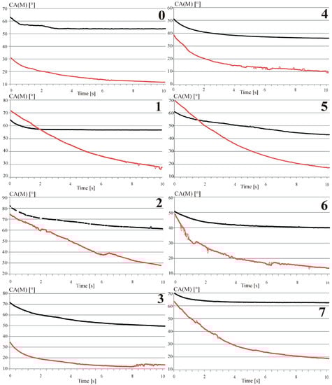 The contact angle characteristic as a function of time for the base (black) and hydrothermally treated surfaces (red) marked in accordance to sample composition. (0): Mg pure—Reference sample; (1): Mg4Y5.5Dy0.5Zr; (2): Mg4Y5.5Dy0.5Zr + 5%BG; (3): Mg4Y5.5Dy0.5Zr + 5%BG + 1%Ag; (4): Mg1Zn1Mn0.3Zr; (5): Mg1Zn1Mn0.3Zr + 5%HA; (6): Mg1Zn1Mn0.3Zr + 5%HA + 1%Ag; (7): Mg1Zn1Mn0.3Zr + 10%HA.