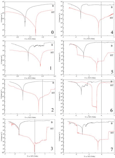 Corrosion resistance data based on potentiodynamic curves of analyzed base (black) and hydrothermally treated surfaces (red) marked in accordance to sample composition. (0): Mg pure—Reference sample; (1): Mg4Y5.5Dy0.5Zr; (2): Mg4Y5.5Dy0.5Zr + 5%BG; (3): Mg4Y5.5Dy0.5Zr + 5%BG + 1%Ag; (4): Mg1Zn1Mn0.3Zr; (5): Mg1Zn1Mn0.3Zr + 5%HA; (6): Mg1Zn1Mn0.3Zr + 5%HA + 1%Ag; (7): Mg1Zn1Mn0.3Zr + 10%HA.
