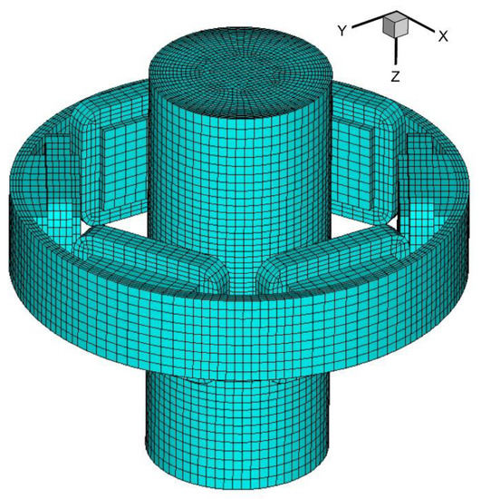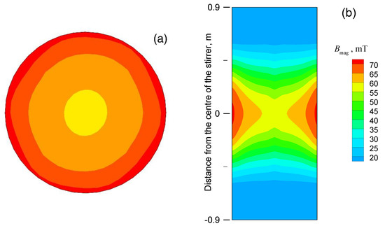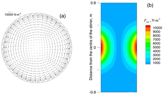 An air cylinder with a radius of 0.9 m and a height of 2.2 m was established around the whole stirring system to calculate the electromagnetic field. The tangential magnetic condition (∂Φ/∂n) = 0 was applied at the outer surface of the air cylinder, where Φ is the reduced scalar potential and n is the normal unit vector to the surface [8,10]. The three-phase coil excitation was applied with source current intensity (I) and frequency.