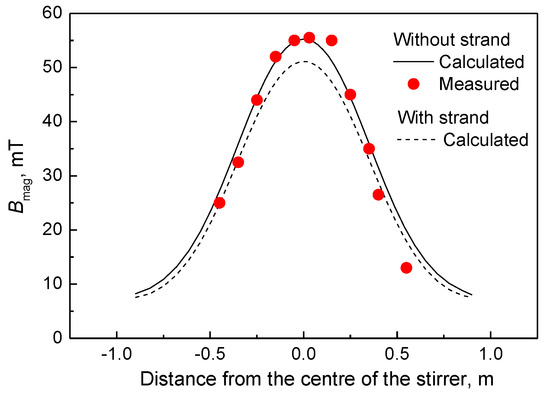 In order to validate the mathematical model of the electromagnetic field, the magnetic flux density in the stirrer was measured along the axial direction without the strand and compared with the numerical simulation results, as shown in Figure 2. The measurement of the magnetic flux density was carried out in a Φ600 mm round bloom continuous caster at a domestic steel mill by using a portable Gauss meter (Bell, FW5180). The calculated values agree well with the measured data, which supports the correctness of the mathematical model and the solution method for the electromagnetic field. Figure 2 also demonstrates that the magnetic flux density in the stirrer with the strand is significantly lower than that without the strand, and the maximum value decreases from 55.4 mT calculated without the strand to 51.1 mT with the strand. This is mainly due to the ‘skin effect’: the strand can shield the electromagnetic field, resulting in a decrease in magnetic flux density.