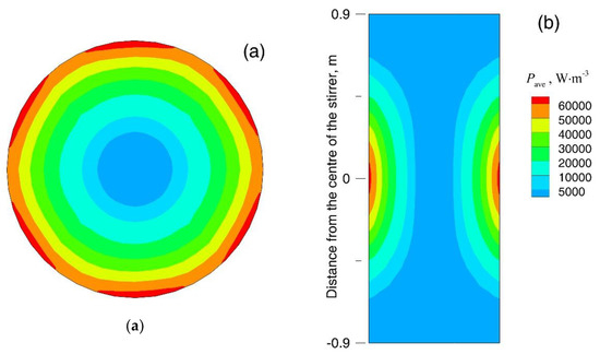 Figure 4 displays the distribution of the time-averaged Joule heat power density in both the cross-section and the longitudinal section of the Φ600 mm round bloom at 400 A and 4 Hz. The characteristic of the Joule heat power density distribution is very similar to that of the magnetic flux density. It can also be seen from Figure 4a that the distribution of Joule heat power density has a hexagonal symmetry at the edge of the strand. This is because the iron core of the stirrer has six protruding tooth parts (see Figure 1), and the Joule heat power density at the edge of the strand near to them is large. Through the integral calculation, it is found that the Joule heat generated by F-EMS in the strand is 5.3 kW, and the quantity of the secondary cooling heat transfer (P) in this region is about 201 kW, which can be approximately calculated using Equation (10) [18]. Therefore, the Joule heat is small and negligible compared with the secondary cooling heat transfer in the stirring zone.