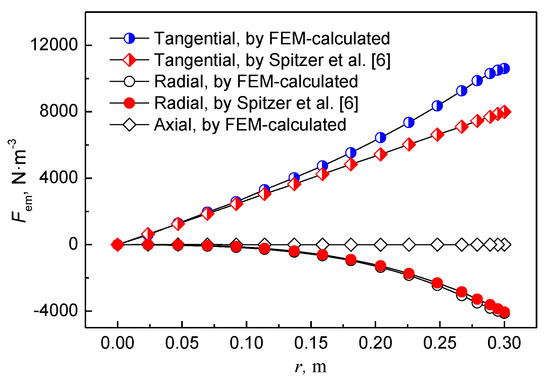 Comparison of FEM-calculated electromagnetic force density with that of the analytical solution by Spitzer et al. [6] in the middle plane of the stirrer for I = 400 A and f = 4 Hz.
