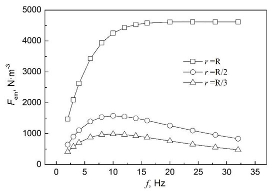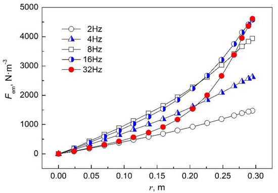 Figure 7 illustrates the variation in the electromagnetic force density in the radial direction at different current frequencies. It can be observed that when the frequency is small, the electromagnetic force density has an approximately linear relationship with the radius, which is consistent with the analytical formula [6]. However, when the frequency is greater than 8 Hz, the electromagnetic force density is no longer linear with the radius due to the ‘skin effect’.