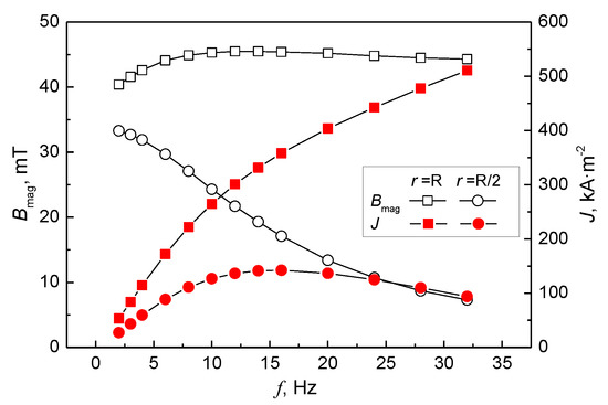 Figure 8 shows the effect of the current frequency on the magnetic flux density and induced current density. It is found that different variations appear at different positions of the Φ600 mm round bloom. At the edge of the strand (r = R), the frequency has little effect on the magnetic flux density, while the induced current density increases significantly with increasing frequency. At r = R/2 of the strand, an increase in frequency leads to a decrease in magnetic flux density, and the induced current density first increases and then decreases, and the maximum value appears at 14 Hz. Since the electromagnetic force density is the cross-product of the magnetic flux density and the induced current density, it can be inferred from Figure 8 that there is a peak in the electromagnetic force density as a function of the current frequency.