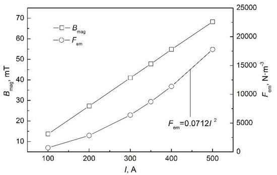 Figure 10 shows the effect of current intensity on the magnetic flux density and the electromagnetic force density. The former increases linearly with an increase in current intensity, while the latter has a quadratic relationship with the current intensity, which is consistent with the analytical formula deduced by Spitzer et al. [6].