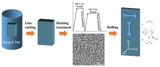 The raw material was Φ 200 mm Ti-55511 forged bar provided by Hunan Goldsky Titanium (Industry Technology Co. Ltd., Changde, China). The chemical compositions (wt %) were Al-5.20, Mo-4.92, V-4.96, Cr-2.99, Zr-1.08, Fe-0.40 and balance Ti. The β transus temperature was measured to be 875 ± 5 °C by a metallographic method. The 110 mm × 45 mm × 12 mm billets were line cut from the forged bar. To obtain the acicular α microstructure, the billets were solution heated at 920 °C for 15 min, water quenched to room temperature, and then aged at 750 °C for 30 min, followed by a final water quenching to room temperature. The as-resulted microstructure shows the homogeneous and triangular distribution of acicular α in β matrix (Figure 1). The heat-treated billets were subjected to the unidirectional hot rolling up to 56% reduction at 750 °C. During rolling, the samples were reduced by 8% in each pass, and after each pass, the billets were put back into the furnace for 15 min in order to re-attain the rolling temperature. After final pass, the deformed samples were water quenched (HR sample), followed by heat treatment at 750 °C for 120 min and then water quenching (HR+ HT sample). The HR and HR+HT samples were line cut along the transverse direction (TD) and rolling direction (RD). The microstructure was observed by the Helios NanoLab G3 UC scanning electron microscopy (SEM) (FEI Electron Optics B.V., Brno, Czech Republic) equipped with Electron Back Scattered Diffraction (EBSD) detector. The samples for SEM were prepared through mechanical grinding and polishing, and then etching with the Kroll’s reagent of 1.5 mL HF + 3 mL HNO3 + 100 mL H2O. The samples for EBSD were prepared through mechanical grinding and polishing, and then electrolytically polishing with 95% ethanoic acid + 5% perchloric acid. And the EBSD data were analyzed by TSL-OIM software (7.3, EDAX, Mahwah, NJ, USA). The texture of samples was measured by the Bruker D8 Discover XRD detector (Bruker, Karlsruhe, Germany) at 30 kV with CuKα radiation. The flat dog-bone-shaped tensile samples (Figure 1) were line cut along TD and RD and then mechanically polished. The tensile tests were conducted by Instron Testing Machine (Instron, High Wycombe, UK) at room temperature with the cross-head speed of 1 mm/min. For the statistical purpose, three tensile samples for each condition were performed. The fracture morphology of tensile samples was observed by NOVATM Nano SEM 230 scanning electron microscope (FEI Electron Optics B.V., Brno, Czech Republic).