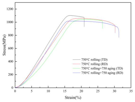 After subsequent HT at 750 °C, the average α size (Figure 3b,d) increases distinctly. According to the Hall-Petch formula [26], the smaller grain size leads to the higher strength. So, the increased average α size after HT leads to the decreased UTS. Additionally, as mentioned above, since the anisotropic strength is resulted from the texture of α phase, the decreased texture intensity ofα phase (Figure 4) leads to the decreased anisotropy of strength between RD and TD.