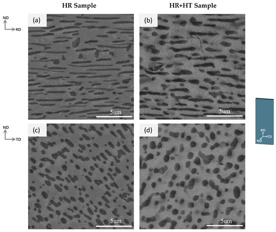 Microstructures in the RD-ND and TD-ND planes of HR and HR+ HT samples. (a,b): ND-RD plane; (c,d): ND-TD plane.