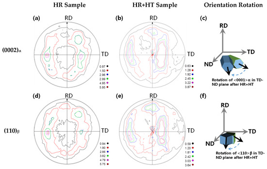 (0002)α and (110)β pole figures of HR and HR+HT samples. (a–c): (0002)α; (d–f): (110)β.