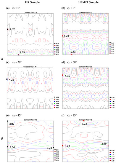 Orientation distribution function (ODF) plots of HR and HR+HT samples. (a,b): φ2 = 0°; (c,d): φ2 = 30°; (e,f): φ2 = 45°.