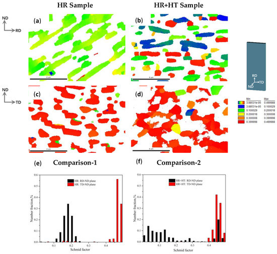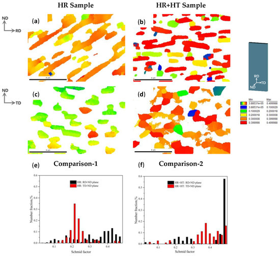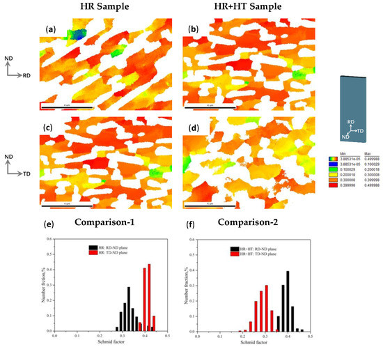 In order to further investigate the effect of texture on the activation of slip system, The Schmid factor (SF) distributions for the common slip systems of α and β phases have been obtained from the EBSD data, which are displayed in Figure 6, Figure 7 and Figure 8, respectively. The α phase shows the obviously different SF distributions of {0001}<11-20> and {10-10}<1-210> slip systems between ND-RD and ND-TD planes of HR and HR+HT samples. As for the {0001}<11-20> slip system ofα phase for HR sample, the SF values in ND-RD plane are all <0.3, while those in ND-TD plane are all >0.4 (seeing Comparison-1 in Figure 6). After HR+HT, the proportion of the SF values >0.4 in ND-RD plane increases, and those in the ND-TD plane are still all higher than 0.4 (seeing Comparison-2 in Figure 6). As for the {10-10}<1-210> slip system of α phase for HR sample, the SF values in ND-RD plane relatively uniformly arrange from 0.1 to 0.5, and the most of SF values in ND-TD plane are located at <0.3. After HR+HT, the SF in the ND-RD and ND-TD planes both shift toward the higher value, in which the proportion of SF values >0.3 increases obviously.
