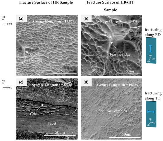 Fracture surfaces of HR and HR+HT samples after tensile tests. (a,b): ND-TD surface; (c,d): ND-RD surface.