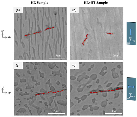 Figure 10 shows the microcracks of HR and HR+HT samples in the ND-RD plane (Figure 10a,b, fracturing along RD) and ND-TD plane (Figure 10c,d, fracturing along TD), respectively. In the ND-RD plane of HR sample (Figure 10a), the microcracks straightly cross the acicular α phase, indicating the transgranular mode. However, in the ND-RD plane of HR sample (Figure 10c), the microcrack propagates along the equiaxed morphology of α phase, implying the intergranular mode. After HR+HT, in the ND-RD plane, the transgranular propagation of microcrack passing through the thicker acicular α shows the zigzag track (Figure 10b), while the ND-TD plane of HR+HT sample presents the transgranular propagation of microcracks (Figure 10d).