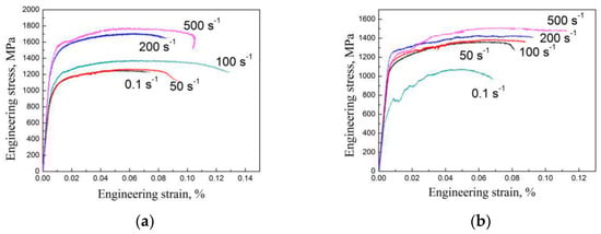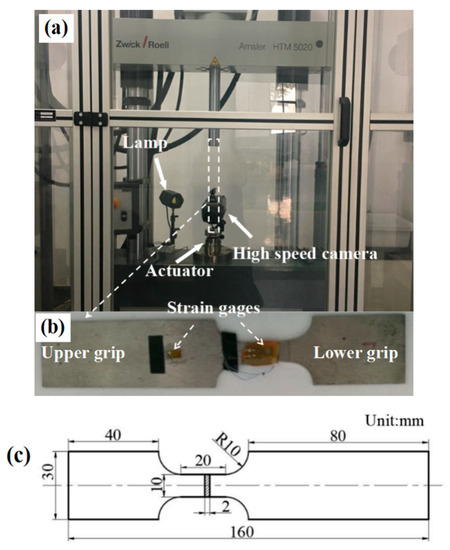 A high-speed testing machine (Zwick HTM 5020, ZWICK/ROELL, Ulm, Germany) at strain rates of 0.1, 50, 100, 200, and 500 s−1 was used to carry out the dynamic tensile testing. The dynamic tensile testing setup and the specimen dimensions are shown in Figure 2. Two samples were prepared for each strain rate in order to minimize the error. The deformation of samples is primarily measured by strain gauges attached to the specimen’s deformation parts in the process of testing, as is shown in Figure 2b. The strain gauge positioning was identical for all dynamic tensile test specimens. During the test, a linear displacement transducer (LDT) was used to measure the displacement of the crosshead, and the strain of the specimen was calculated from this acquired displacement. The data synchronous acquisition of dynamic load, displacement, strain and loading rate was performed at a natural frequency of 1 MHz during the dynamic tensile tests.