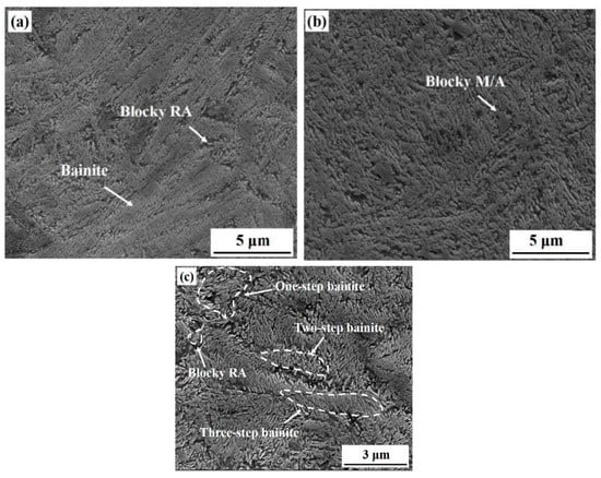 Figure 3a,b show the morphology of the bainite, retained austenite, and martensite in B3 and Q&P specimens. They are constituted of two types of retained austenite, which are blocky and film-like retained austenite. The volume fraction and the size of the retained austenite are different in these two samples. In this study, the blocky retained austenite obtained in the Q&P samples was quite large as compared to that obtained in B3 samples. Figure 3c shows a high magnification of SEM microscopic image of B3 samples. Moreover, it shows that the one-step bainite (with a thickness of 100~300 nm), which is obtained in the first step of the isothermal process, is conventional bainite. The two-step bainite (with a thickness of 50~210 nm) and the three-step bainite (50~100 nm of thickness), which are obtained in the second and third steps of the isothermal process, are nanostructure bainite.