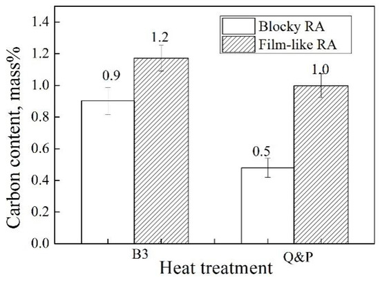 Figure 4 shows the point scanning results of the carbon element with different heat-treated samples. The results are shown by the mean value of the measurement area of the beam spot with a diameter of 1 µm. It is evident that the carbon content in the film-like retained austenite is higher than that of the blocky retained austenite.