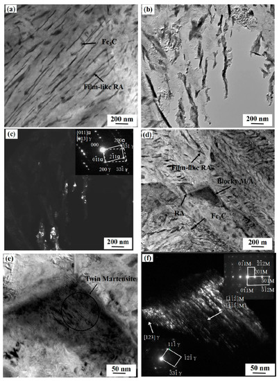 With a high-speed tensile test at a strain rate of 500 s−1, the volume percentage of retained austenite for the samples of B3 and Q&P processes were 12.3% and 17.6%, respectively (Table 2). The volume fraction decreased by 48.1% for the B3 sample and by 21.4% for the Q&P sample as compared to the initial volume percentage of retained austenite before the tensile test. This result indicated that the martensitic transformation occurs in the B3 and Q&P steels with the decrease of retained austenite. Figure 6 show the bright field (BF) image, dark field (DF) image and the selected area electron diffraction (SAED) pattern of the specimens at a strain rate of 500 s−1 after the dynamic tensile test. After conducting the dynamic tensile test the martensite was identified according to SAED pattern in B3 and Q&P samples. The spots , and , correspond to martensite in Figure 6c,f, respectively. The existence of the retained austenite after the dynamic tensile test is also confirmed near the martensite by the TEM observation, as shown in Figure 6c,f. This finding verifies that the martensite is formed by the strain-induced transformation of the retained austenite during the deformation.