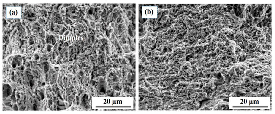 Typical SEM fracture morphologies of samples (a) B3 and (b) Q&P tested at a strain rate of 500 s−1.