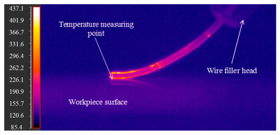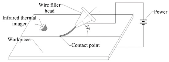 The TPS2700 wire feeder (Fronius International GmbH, Cologne, Germany) with wire heating function was used in experiments. The adjustable range of wire heating current of the wire feeder was 0–270 A, and the adjustable range of wire feeding rate was 0.5–22 m/min. During heating the welding wire, the positive pole of the wire feeder power source contacted the welding wire through the wire feeding head, while the negative pole contacted the base metal. When the current circuit was closed, the resistance heat would generate in the welding wire between the positive and negative poles. The heating temperature of welding wire could be adjusted by adjusting the current. Before the welding experiments, the relations between the current and the welding wire temperature were obtained firstly by using infrared thermal imager to detect the temperature of welding wire under different currents. The model of infrared thermal imager was FLIR A615 (Gongyue Electronics Co., Ltd., Shanghai, China), the measurable temperature range was +300~2000 °C and the accuracy was ±2 °C. The schematic diagram of welding wire temperature measuring is shown in Figure 1. The vertical height between the wire feeding head and the workpiece was 10 mm, the horizontal distance from the contact point between welding wire and base metal to the wire feeding head was 20 mm, and the wire feeding angle was 30°. During the testing, the contact between welding wire and base metal should be guaranteed. Infrared thermal imager was set on side to shoot the thermal images of welding wire. After measurement, the temperature of welding was obtain based on the thermal images.