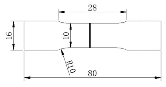 After welding, the appearance formation of the weld was observed and analyzed first. The welded specimen was cut and the cross section of weld and tensile sample was obtained, as shown in Figure 3. Then, the weld cross section was ground with abrasive paper and polished with diamond polishing agent with a grain size of 2.5 μm. Afterwards, 40% hydrofluoric acid (HF), 38% concentrated hydrochloric acid (HCI), 68% concentrated nitric acid (HNO3) and distilled water (H2O) were used to prepare a etchant liquid by a volume ratio of 2:1:1:40, and then the weld cross section was corroded. In the experiments, the morphology of cross section and the metallographic structure of welds were observed by a VHX-500FE digital microscope (KEYENCE Corporation, Osaka, Japan) with super wide-field view. The microhardness of the welds was measured by a HVS-1000A Vickers microhardness tester (Laizhou Huayin Test Instruments Co. Ltd., Yantai, China) with a load of 50 g on the indenter for 10 s. The tensile strength was tested by a RG4100 electronic universal testing machine (Wance Technologies Ltd., Shenzhen, China), and the drawing speed was 2 mm/min. the micro morphologies of fractures of tensile specimens were observed by using the JSM-6380LV scanning electron microscope (SEM) (JEOL, Tokyo, Japan).