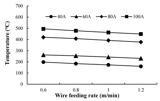 As shown in Figure 5, the temperature of the welding wire increased with the increase of current, while the temperature decreased with the increase of wire feeding rate. The reason was that when the wire feeding rate increased, the length of welding wire to be heated within the unit time increased, thus the welding wire temperature decreased. When the current increased from 60 A to 80 A, the welding wire temperature increased by a large amplitude. That was because, with the increase of welding wire temperature, the resistivity of welding wire increased significantly, and more resistance heat was generated within the unit time, so the increasing amplitude of the temperature was large.