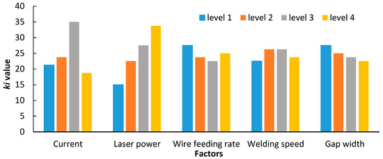 As shown in Table 6, during laser hot-wire welding, the factors whose significance of influence on the weld formation as ranked from high to low were laser power, current, gap width, welding speed and wire feeding rate. According to Figure 6, the ki values of laser power and current fluctuated greatly with the change of levels, indicating that the weld formation quality was significantly influenced by laser power and current. This was because both the laser power and the current were important heat sources during welding process, which simultaneously decided the pool width, weld penetration and the melting degree of welding wire. During laser hot-wire welding, the current only heated the welding wire, while the laser heated both base metal and welding wire. Laser power had greater influence on the weld penetration and pool width than current. Therefore the laser power had the greatest influence on weld formation. Moreover, the ki values of wire feeding rate, welding speed and gap width under different levels were small and their differences were small, indicating that their influences on weld formation quality were small and similar.