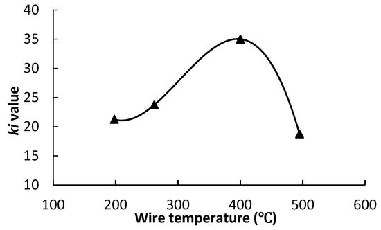 On the basis of the relation between current and welding wire temperature shown in Figure 5 and the influence laws of current on the weld formation of laser hot-wire welding shown in Figure 6, the relationships between the welding wire temperature and the weld formation quality coefficient ki were obtained, as shown in Figure 7. The figure showed that as the welding wire temperature increased from 200 °C to about 400 °C, the weld formation quality coefficient ki increased gradually, which represented the weld formation quality becoming better. However, as the welding wire temperature increased further above 400 °C, the weld formation quality coefficient ki decreased, which represented the weld formation quality becoming worse. During laser hot-wire welding, if the welding wire heating temperature was too low, more laser energy would be absorbed by the wire, and less laser energy would be used for melting the base metal, which could cause lack of fusion to the weld. If the welding wire heating temperature was too high, the welding wire would absorb less laser energy and more laser energy would be used for melting the base metal, which could cause over-penetration to the weld. Therefore, with the gradual increase of welding wire temperature, the ki increased firstly and then decreased. This indicated that an optimal range existed for the welding wire heating temperature during laser hot-wire welding. Thus, the matching relationship existed between current and laser power. When the laser power matched the current, the welding wire could be preheated to an appropriate temperature and could be stably fed and fully fused, the base metal could reach an ideal depth of fusion, and good weld formation could be obtained.