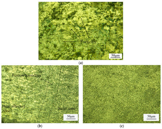 Metallographic structure of base metal and weld cross section. (a) Base metal; (b) Heat affected zone; (c) Weld zone.