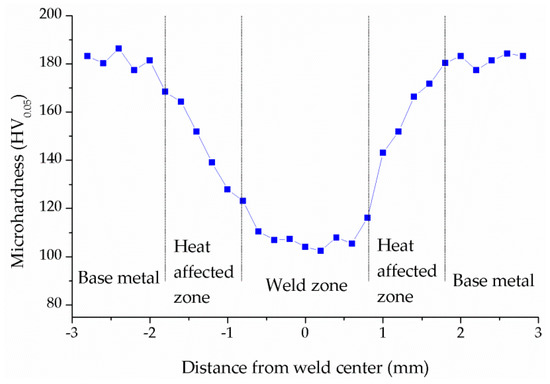 Figure 10 shows the detected microhardness of the weld specimen. As shown in the figure, the softening phenomenon occurred in the weld zone. The average hardness of the base metal was 182 HV0.05, while the average microhardness of the weld zone was 114 HV0.05 (62.6% of base metal). The metallographical structure analysis showed that the weld zone presented a casting metallographical morphology after re-melting and rapid cooling during welding process. The swelling existed in the casting metallographical structure of the weld zone, which caused the decrease of microhardness. However, the base metal had a rolled metallographical structure, which was compact and had strengthening secondary phase reinforced mechanical properties, so that the base metal had higher microhardness. Although the grain size of weld zone was less than that of the base metal and finer grains could help to improve the microhardness of the weld, it still could not remedy the low microhardness feature of the casting structure. The microhardness of the heat affected zone decreased gradually from the base metal to the weld zone. The reason was that different positions away from the weld zone suffered different degrees of heat effect. The position close to weld zone suffered greater influence of high temperatures, and the microhardness was low. The position close to the base metal suffered smaller influence of high temperatures, and then the microhardness was closer to that of the base metal. As shown in Figure 10, the heat affected zone had a big width about 0.98 mm. This was mainly because 7075 aluminum alloy had high heat conductivity coefficient, thus the high temperature transmission distance was large.