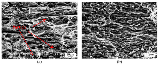 In order to further analyze the fracture mode, the fracture morphologies were observed using a scanning electron microscope, as shown in Figure 11. The fracture of the base metal had larger-size and deep dimples, and prominent tearing ridges existed around the dimples. Thus, it could be inferred that the base metal was of ductile fracture morphology. In addition, the fragmentized grains could be clearly observed in the dimple at base metal fracture. These grains were the strengthening secondary phase which played a role in enhancing the strength of the base metal. At the weld fracture, a large number of small-size and shallow dimples were observed, and the tearing ridges were also distributed around the dimples, so that the weld specimen was also of ductile fracture morphology. However, at the weld fracture, the depth and size of the dimple were obviously smaller than those at base metal fracture, indicating that the base metal had larger elongation than the weld. This result was mutually verified with the elongation results in Table 7. There was no strengthening phase observed in the dimple at the weld fracture, which was one of the reasons why the tensile strength of the weld specimen was lower than that of the base metal. Another reason was that the rolled structure of the base metal had higher strength than the casting structure of the weld specimen.