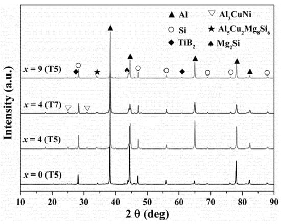 Figure 1 shows the XRD spectra of the in-situ xTiB2/Al-12Si composites (x = 0, 4 and 9 wt.%) at T5 states and the in-situ xTiB2/Al-12Si composites (x = 4 wt.%) at T7 state. The spectra of composites can all be indexed to Al, Si, and TiB2. The presences of intermetallic compounds (e.g., Al3CuNi, Al5Cu2Mg8Si6, and Mg2Si) are also evident in the XRD patterns.